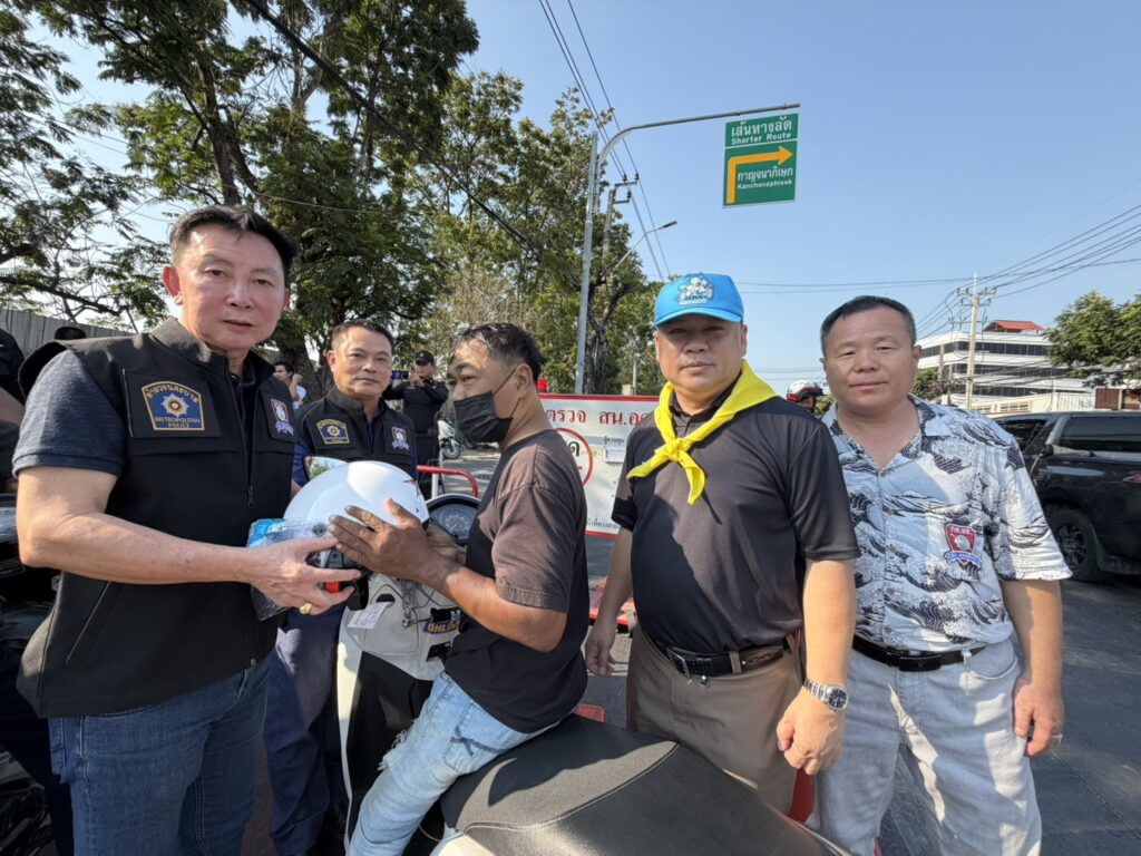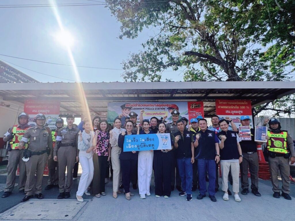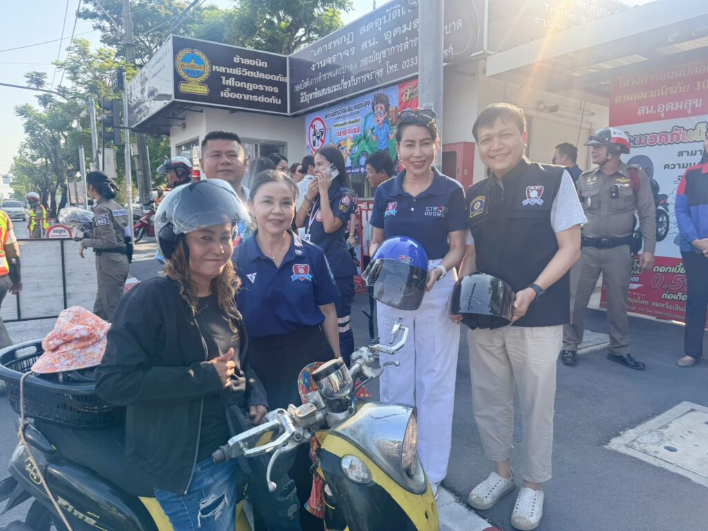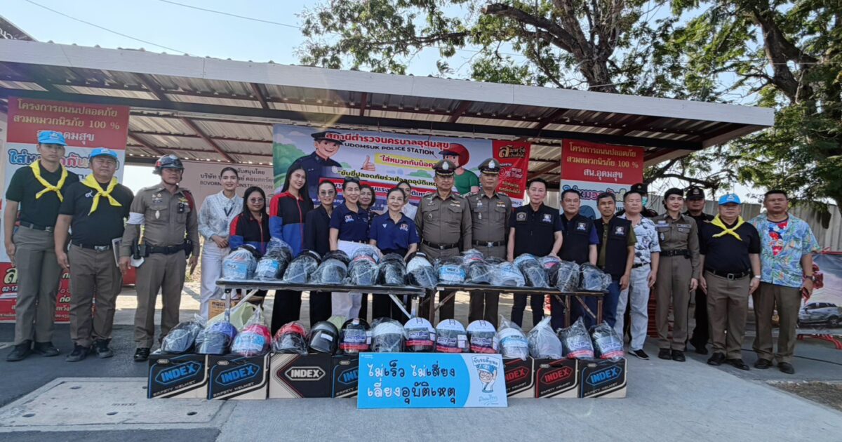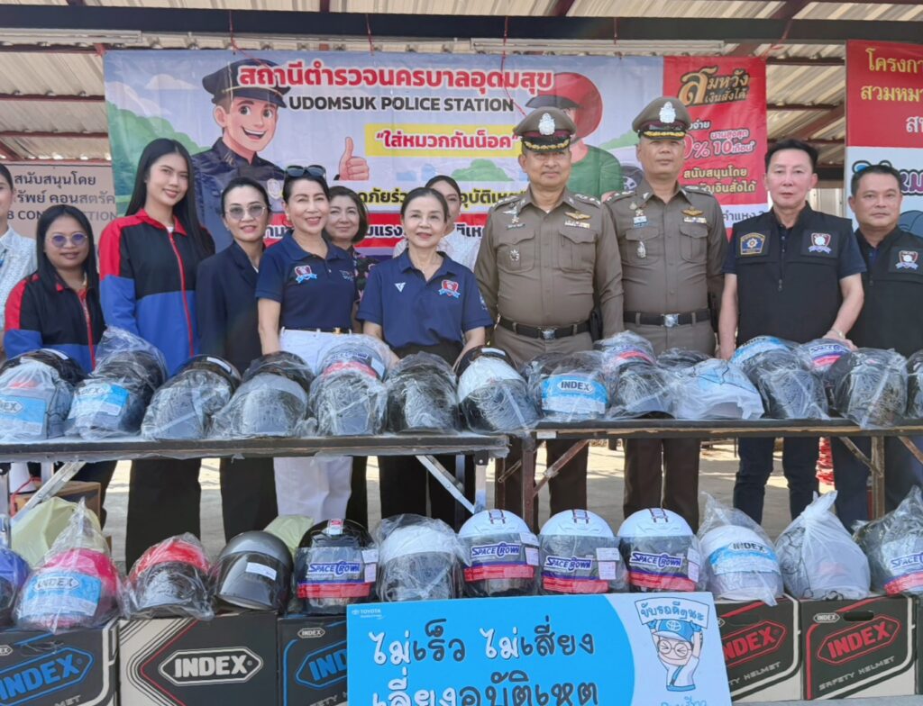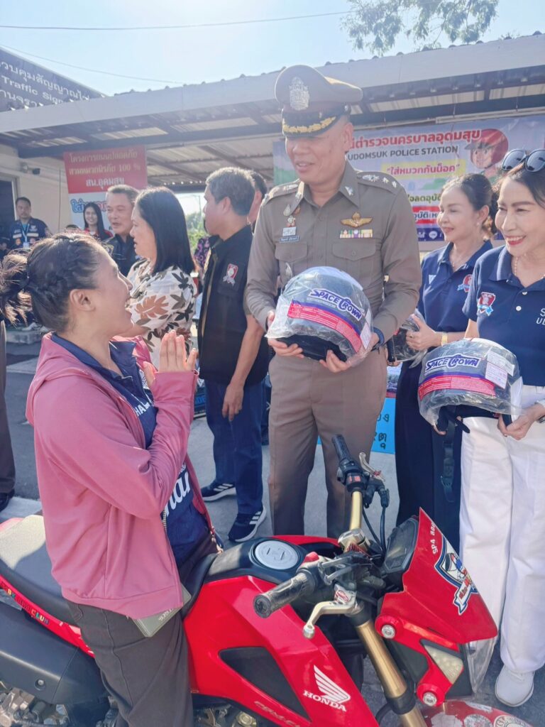 สน.อุดมสุข ได้จัดกิจกรรมแจกหมวกนิรภัย ให้กับพี่น้องประชาชน ที่ขับขี่รถสัญจรไปมา และกลับบ้านช่วงเทศกาลวันสงกรานต์